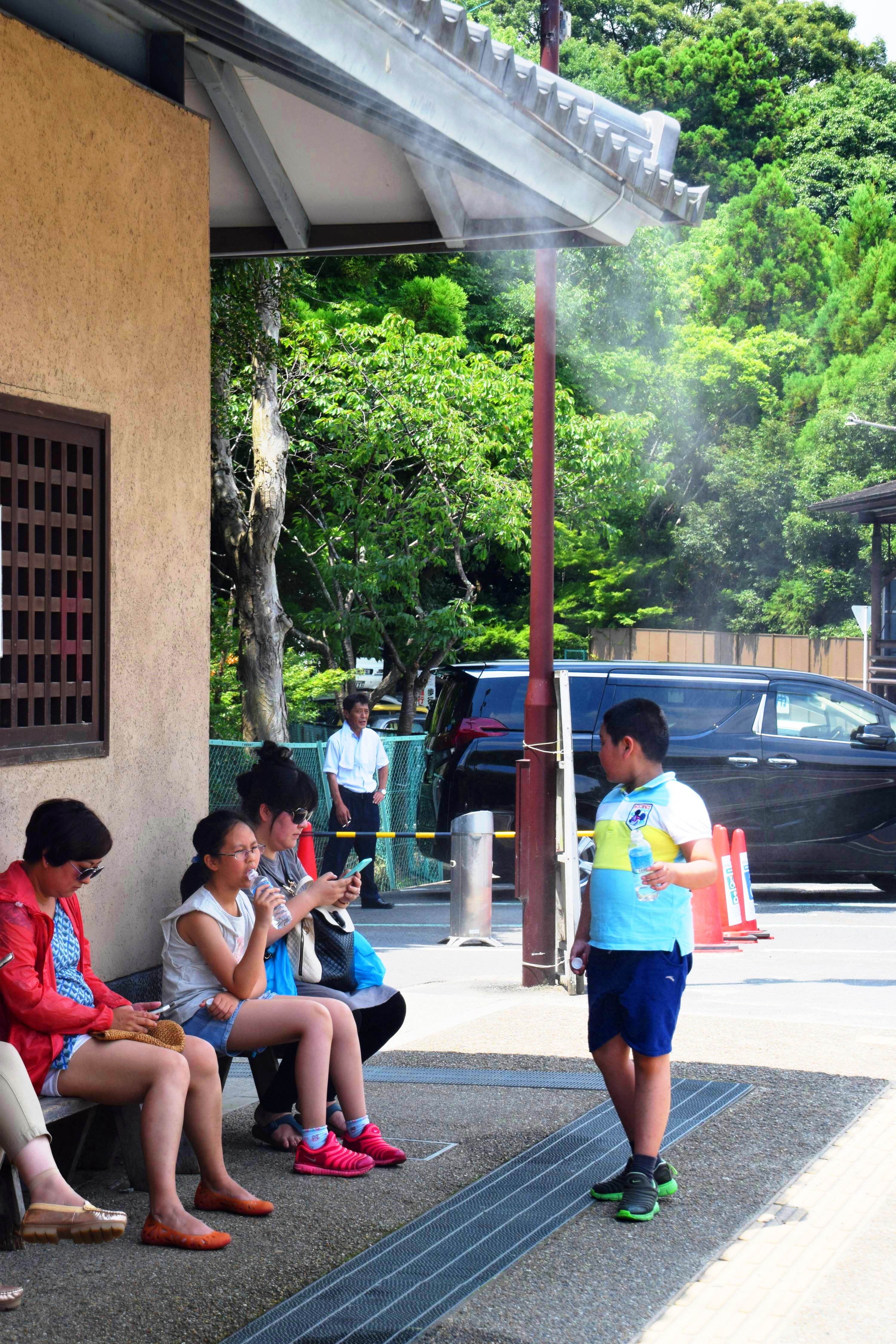 ミスト下で休憩する観光客ら