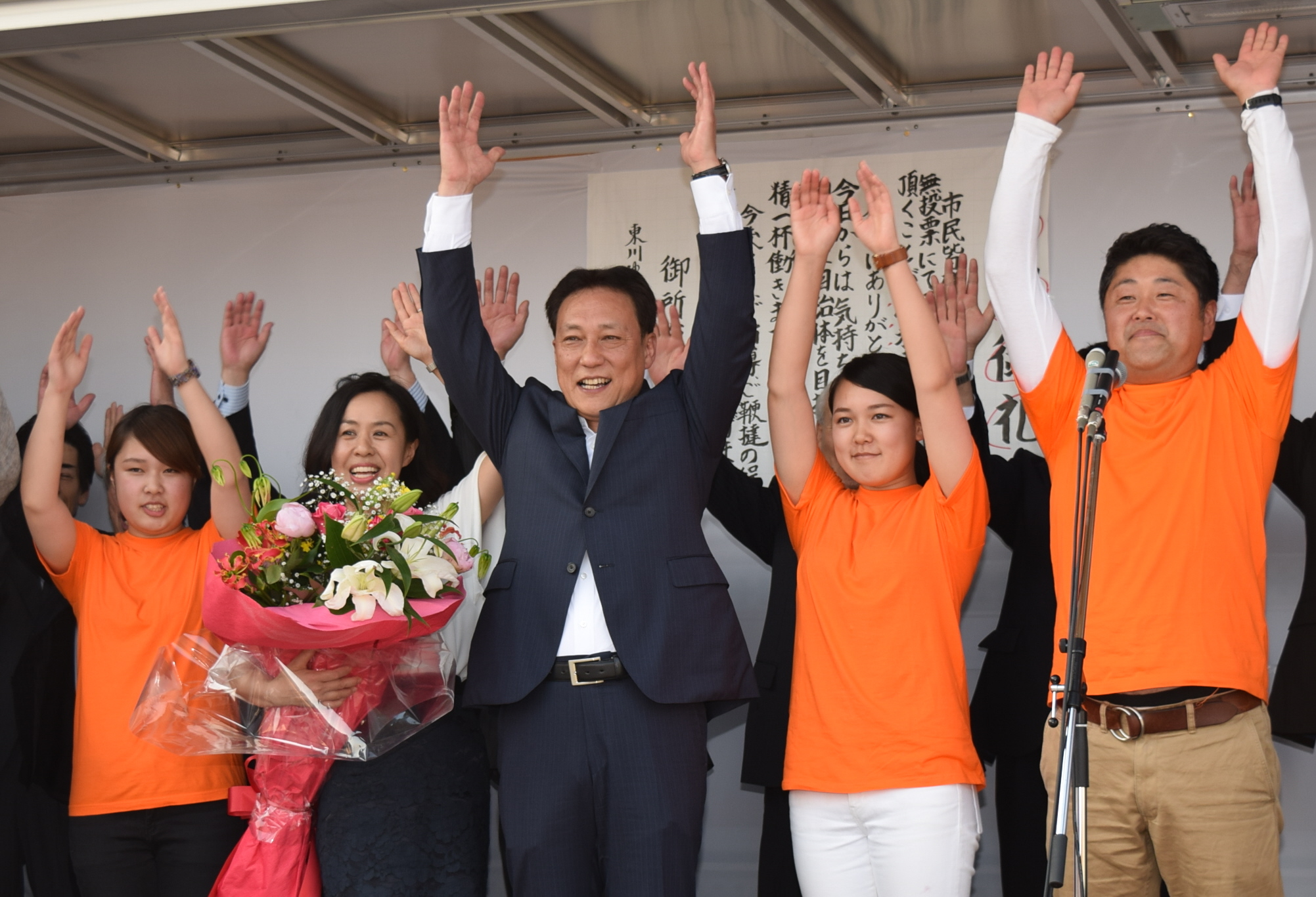 3選を決めた東川氏は同駅近くで支援者らにあいさつ。「市政には課題が山積しており、責任の重さを感じている。覚悟を持って決断し、責任を持って実行して、市民に(課題解決の)実現が見えるようにする」と抱負を語った。