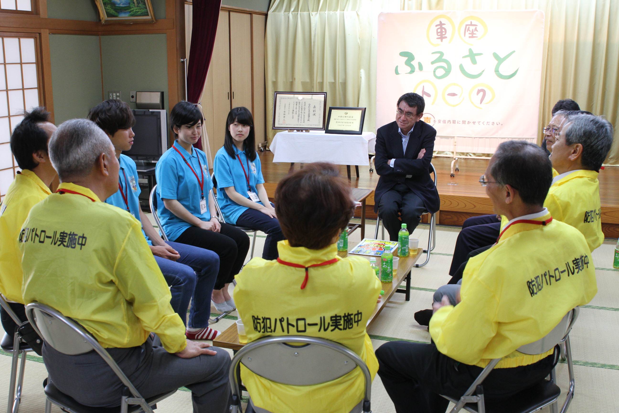 閣僚らが全国各地へ赴き、さまざまな地域課題について住民らと意見交換する「車座ふるさとトーク」が上牧町の桜ケ丘老人憩の家で行われ、河野太郎国家公安委員長が防犯ボランティアに携わる自治会や大学生と地域の防犯対策などについて話し合った。
