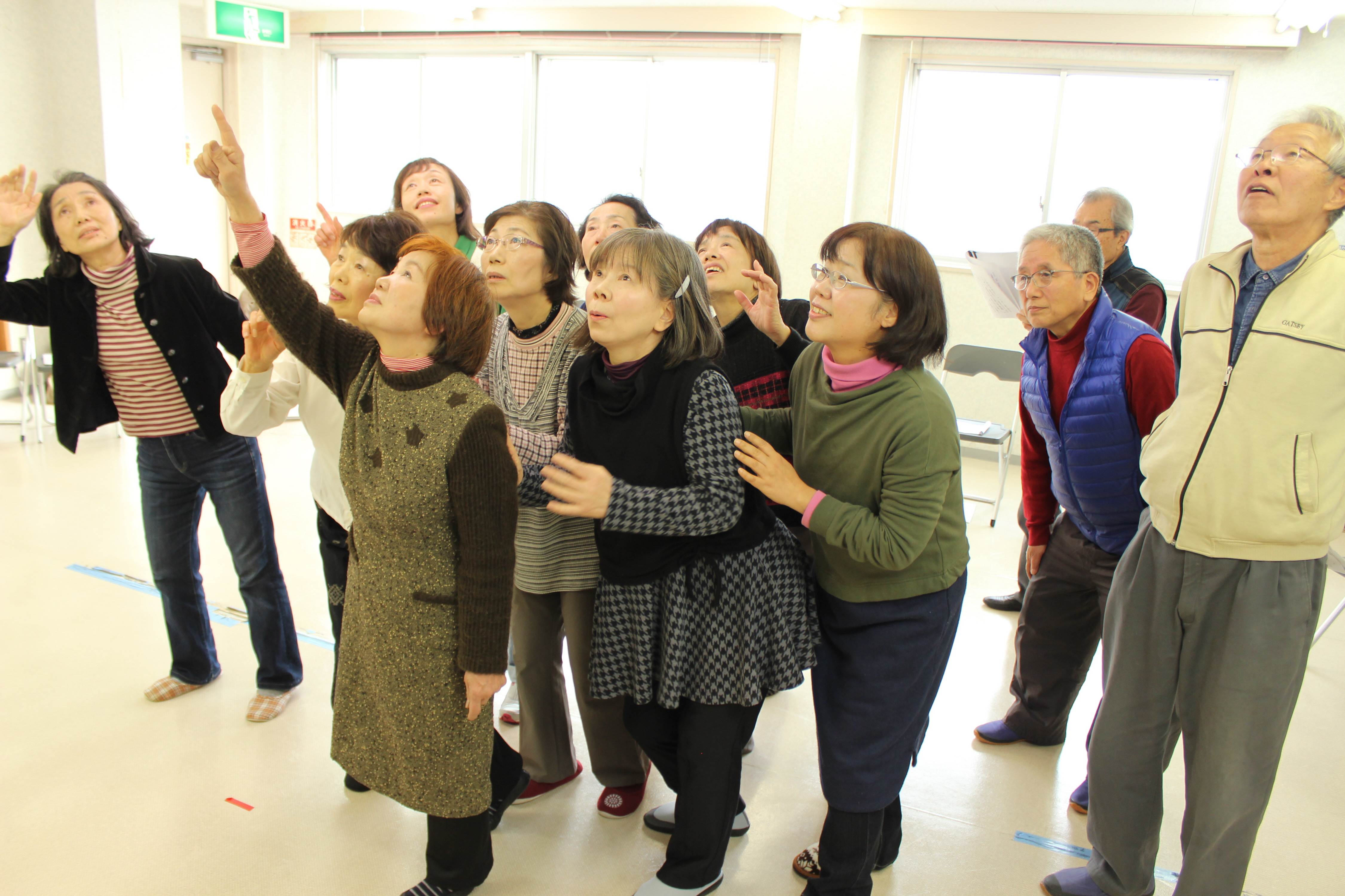 真剣な表情で練習に励んでいる「らくらく演劇塾」は、主婦やシニア層を中心に11年前に結成。現在20人が所属し、年1回の「劇場公演」や老人ホームでの「でまえ公演」を行っている。