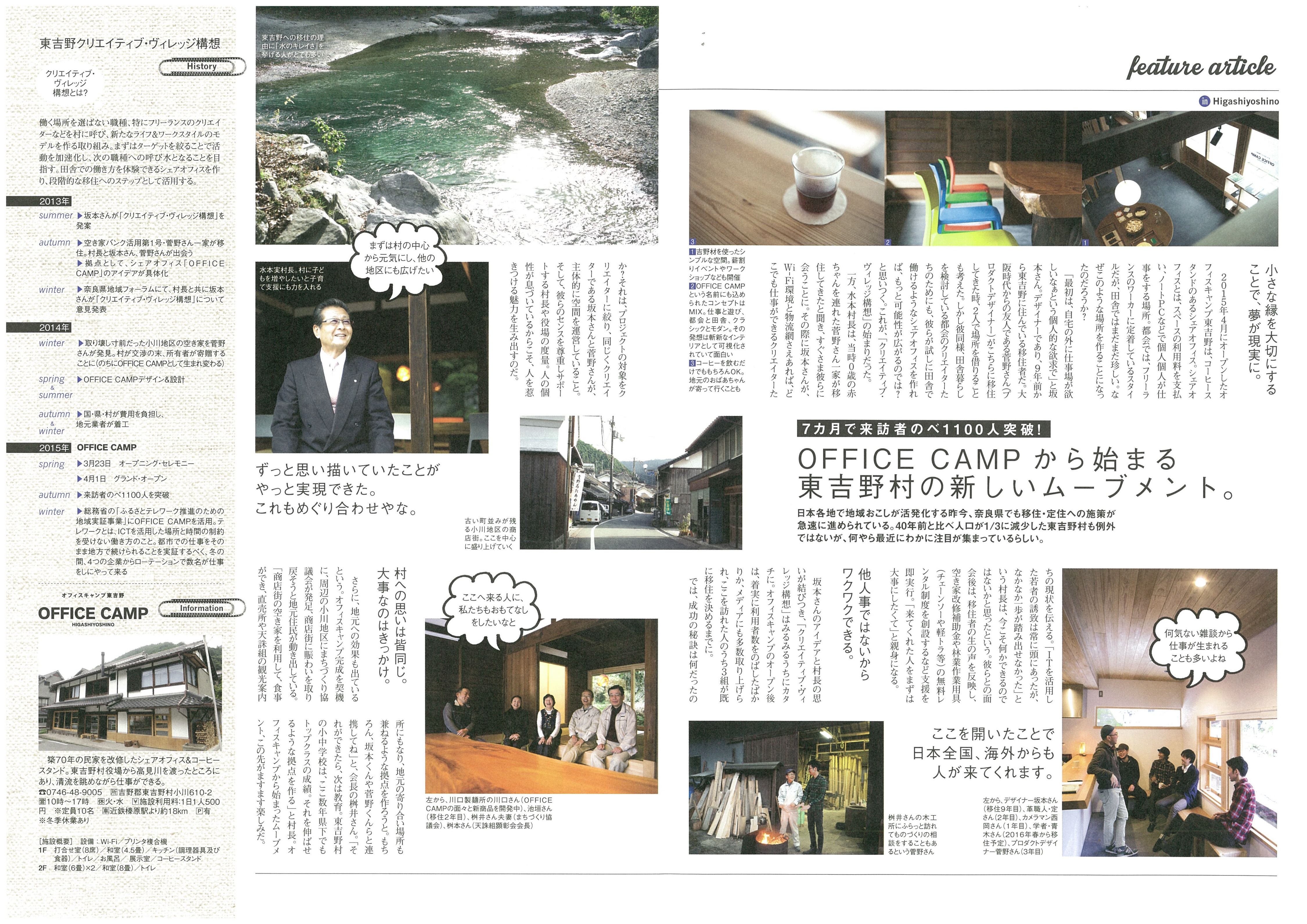 A4判でカラー刷り4ページ。創刊号では、東吉野村で進むシェアオフィスの取り組みなどを特集。9年前に移住したデザイナーの坂本大祐さんを中心に構想が進んだもので、村も全面協力し、役場近くの築70年の民家を改修、昨年4月に完成した。