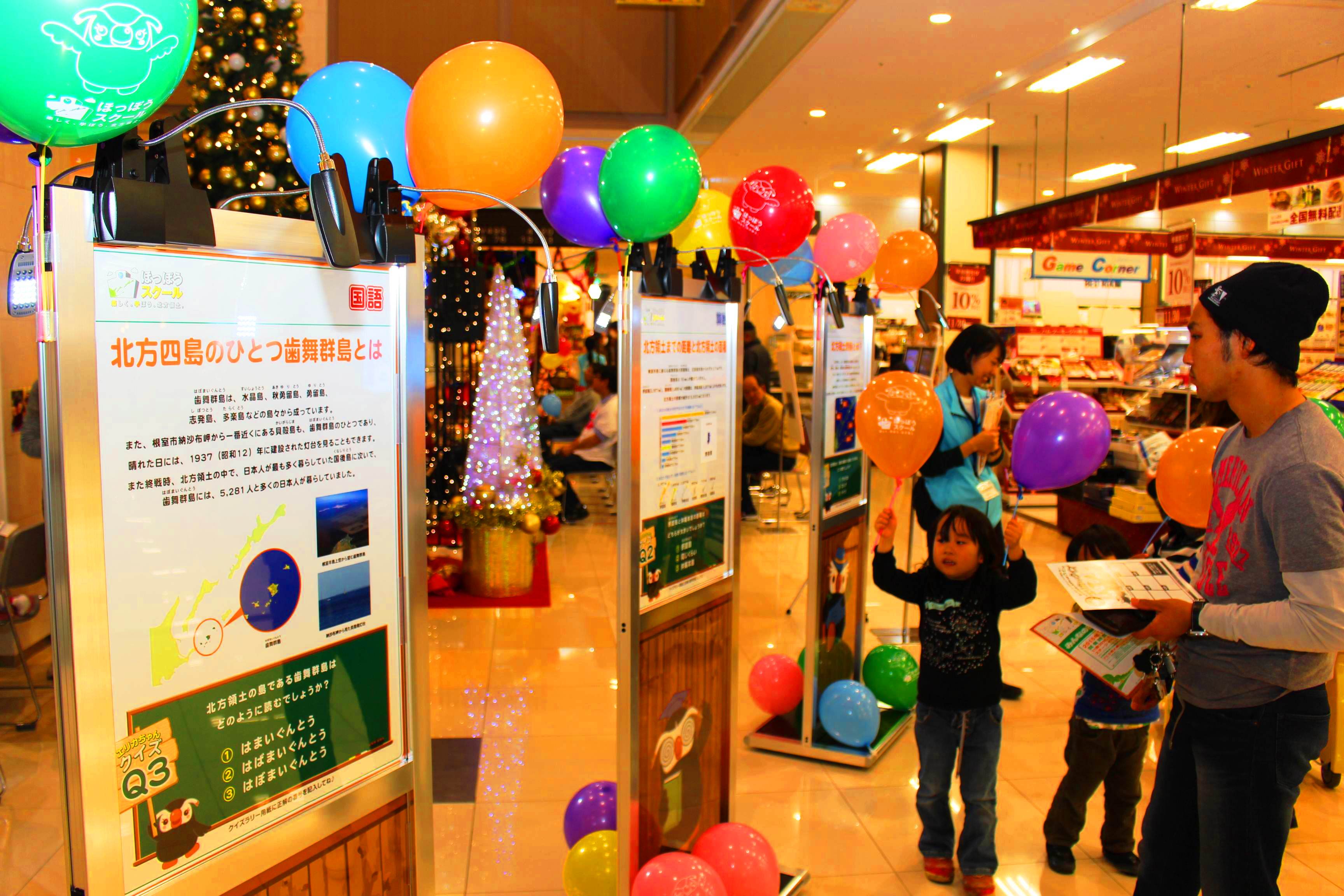 会場では北方領土の歴史や気候などを説明するパネルを使ったクイズラリーや、子供向けの塗り絵、パズルコーナーも設けられ、家族連れが訪れていた。
