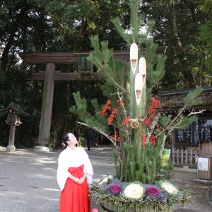 大門松は二の鳥居前に設置され、県花き植木農業協同組合が毎年奉納。良質の県産材にこだわり、松や竹、梅をはじめ葉ボタンやナンテンなどで飾りつけている。